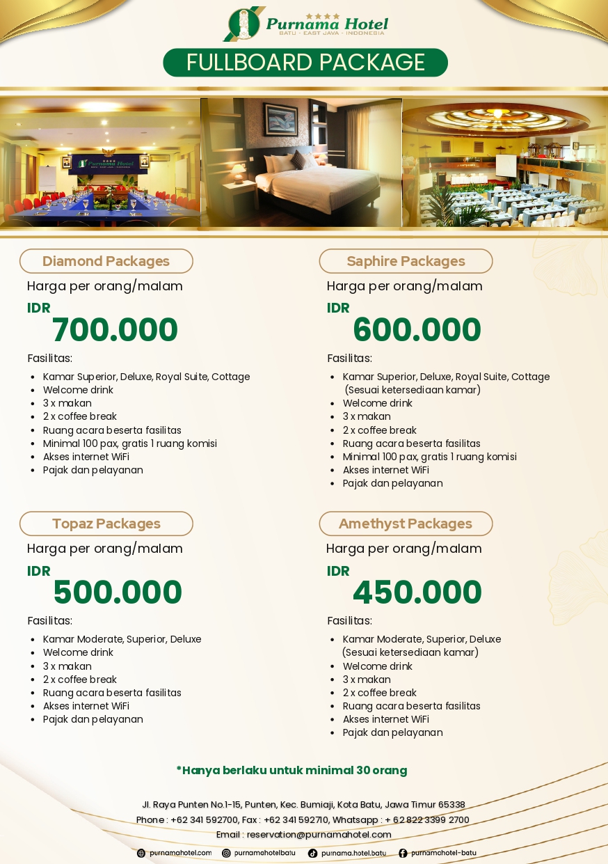 Each package is designed to provide maximum comfort, from classy rooms to delicious meals three times a day. There are four package options available—Diamond, Sapphire, Topaz, and Amethyst—which include event room facilities, coffee breaks, WiFi access, as well as tax and service charges. Suitable for corporate events, gatherings, or group events with a minimum of 30 participants.